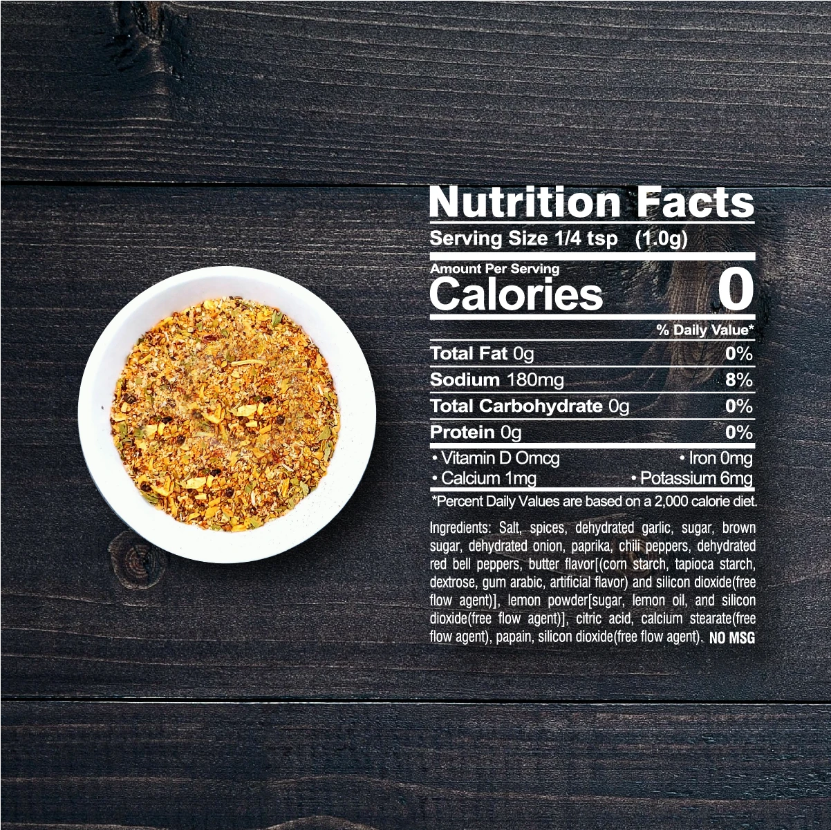 Ingredienti: sale, spezie, aglio, zucchero, brown sugar, cipolla, paprika, peperoncino, polvere di limone (zucchero, olio di limone), acido citrico, papaina, aroma di burro artificiale, meno del 2% di stearato di calcio e diossia di silicio aggiunti come coadiuvanti tecnologic. NO MSG