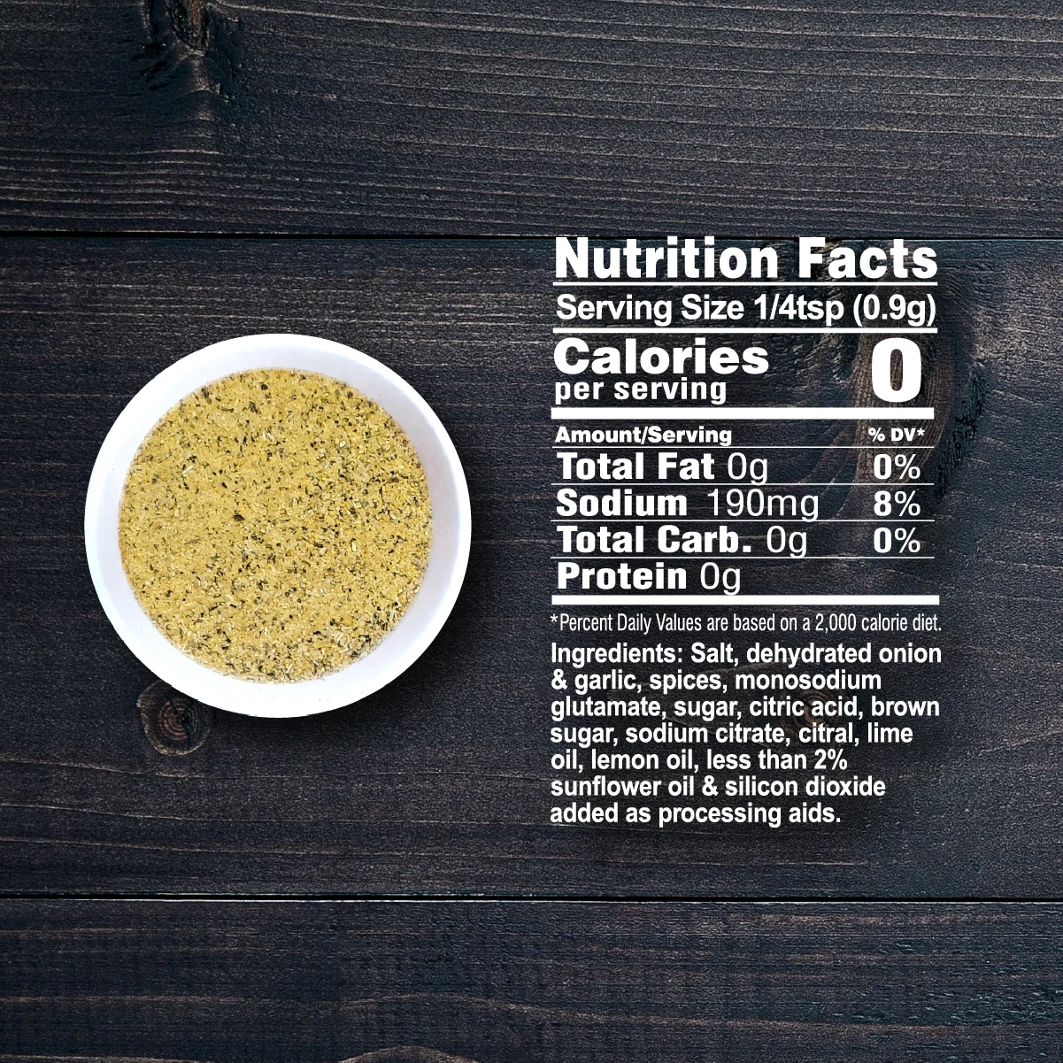 Ingredienti: Sale, cipolla e aglio disidratati, spezie, glutammato monosodico, zucchero, acido citrico, zucchero di canna, citrato di sodio, citrale, olio di lime, olio di limone, meno del 2% di olio di girasole e biossido di silicio aggiunti come coadiuvanti tecnologici.