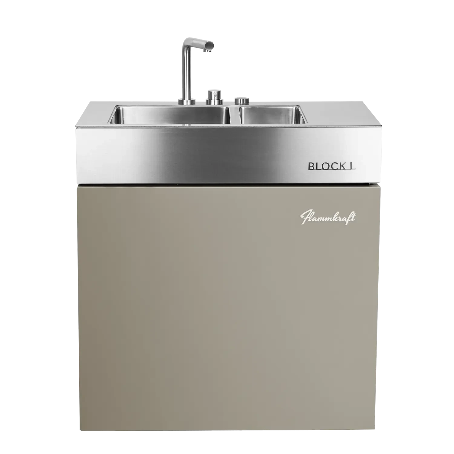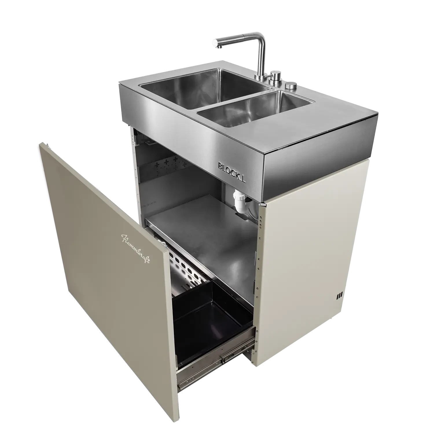 Dotato di un doppio lavello isolato e di un rubinetto girevole e retrattile con testa estraibile. Il Block L permette così di lavare e preparare direttamente gli alimenti o di lavarsi le mani all’aperto, evitando inutili spostamenti in casa. Il supporto in acciaio inox incluso per i dispositivi Sous-Vide amplia ulteriormente le possibilità di utilizzo.
