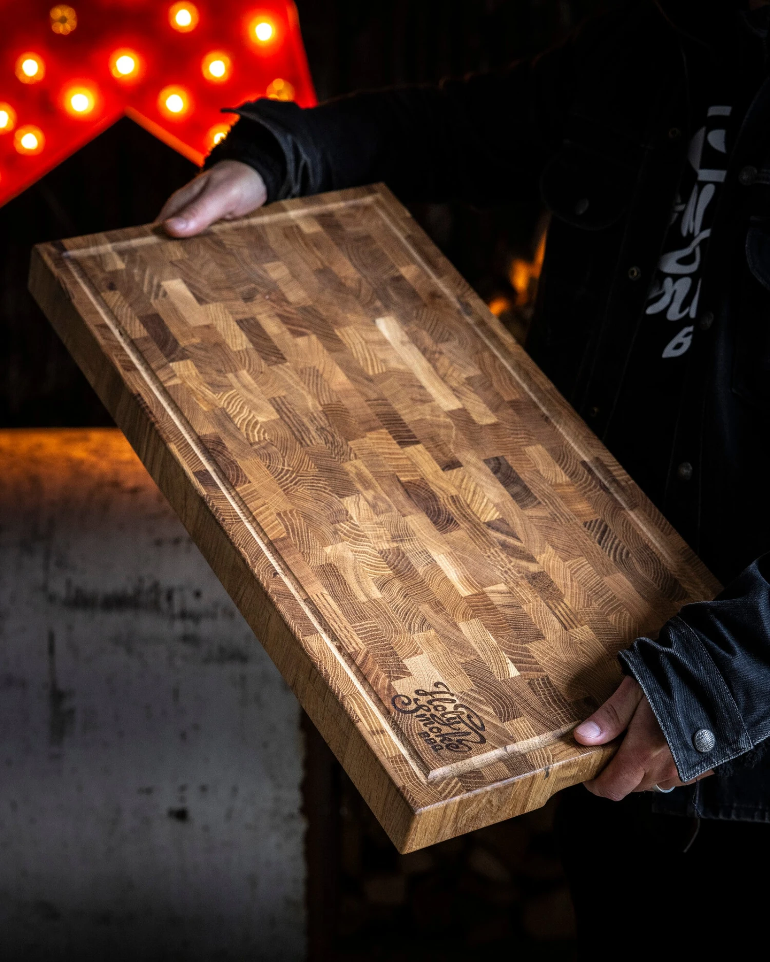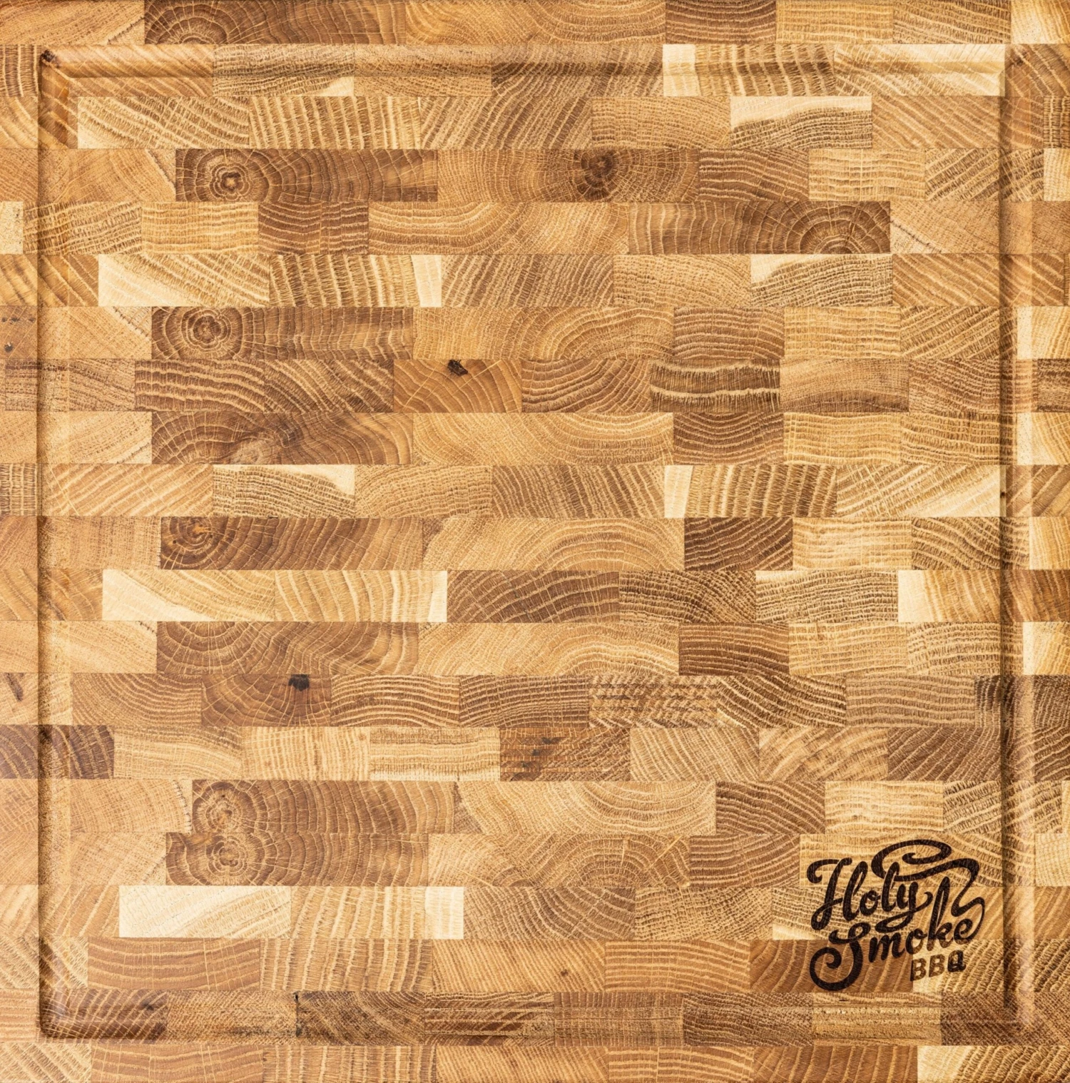I Butcher Block Holy Smoke BBQ sono realizzati con la tecnica End Grain, che crea una superficie di taglio a scacchiera con una durevolezza di livello professionale. Apprezzati da professionisti, chef e amanti del BBQ!