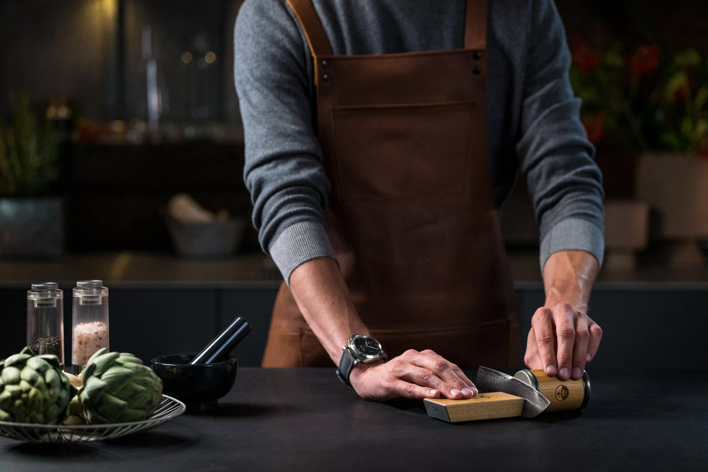 Dopo aver utilizzato la mola diamantata standard, il disco di sbavatura in ceramica rimuove la bava e affina il risultato dell’affilatura. Le scanalature integrate rimuovono la polvere di affilatura dal filo del coltello, garantendo così un filo liscio.