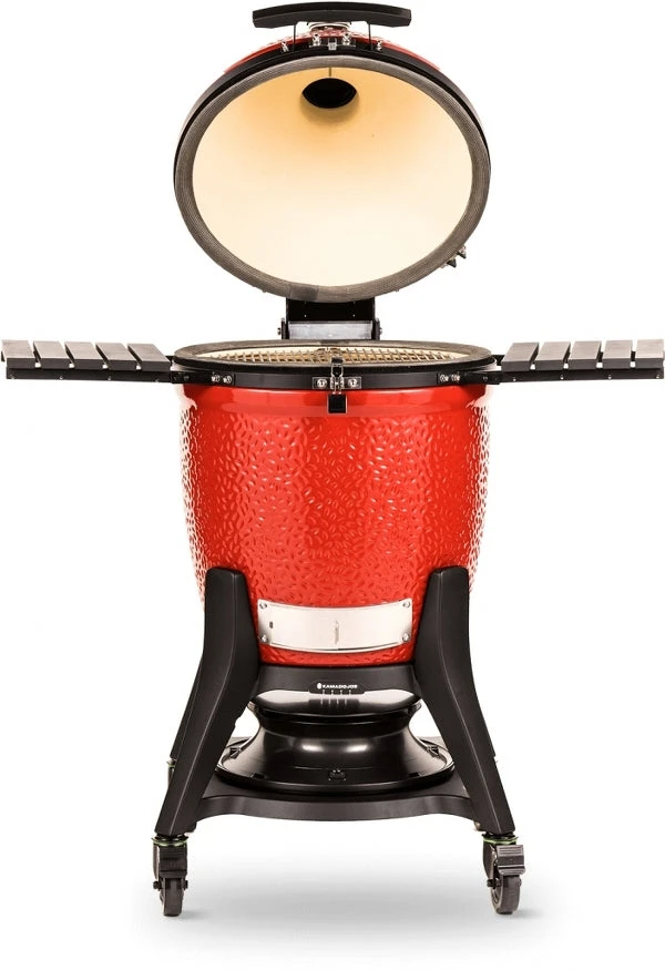Altre innovazioni proprietarie di Kamado Joe® fornite di serie con Classic III includono il sistema di cottura flessibile Divide & Conquer® a 3 livelli con un cestello in acciaio inossidabile, ripiani laterali in alluminio resistenti al calore e verniciati a polvere, un carrello di alta qualità per un facile spostamento costruito in acciaio zincato resistente alle intemperie e l’innovativo e avanzato FireBox multi-pannello oltre ad un cassetto cenere estraibile brevettato per una facile pulizia.