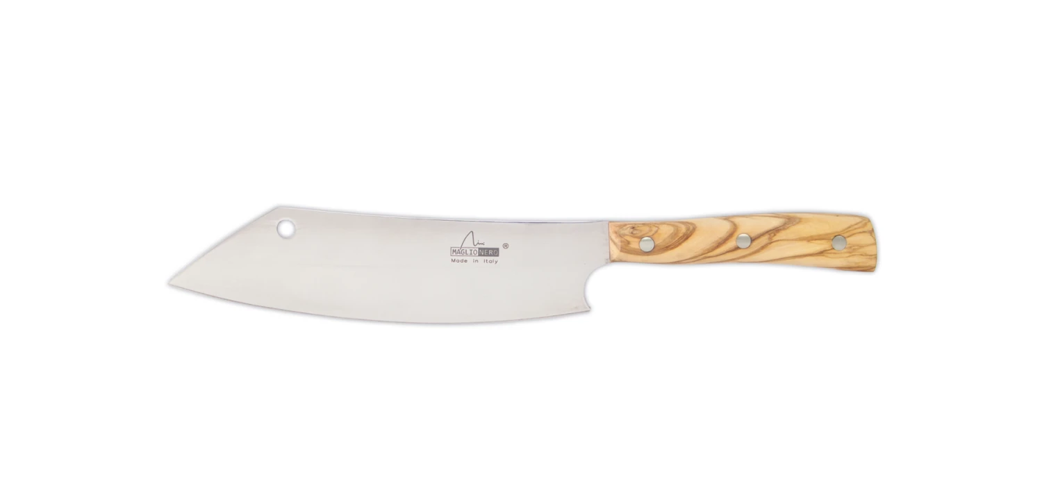 Le lame sono realizzate in acciaio Nitro B con durezza 57 HRC; questo garantisce un’elevata tenuta del tagliente ed una spiccata resistenza alla corrosione. I manici sono a codolo pieno ed in ULIVO lucidato, con i rivetti in Inox. Il design è studiato per offrire a questa linea una confortevole impugnatura ed ottimizzazione del bilanciamento del coltello.