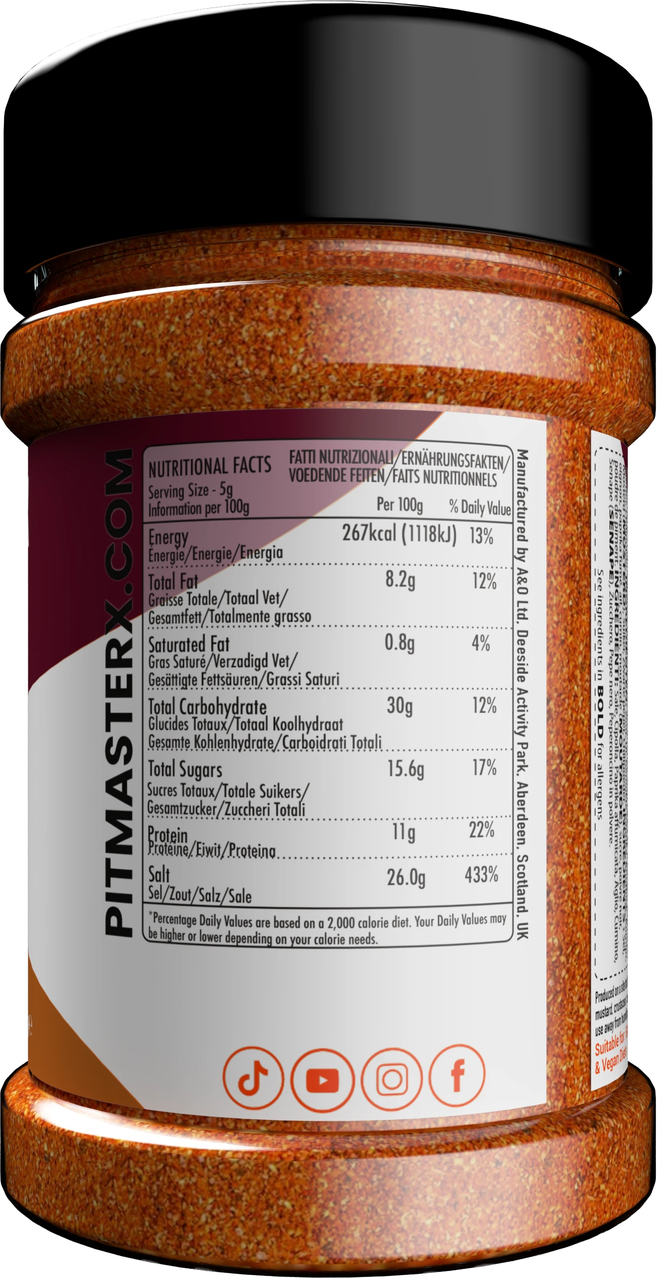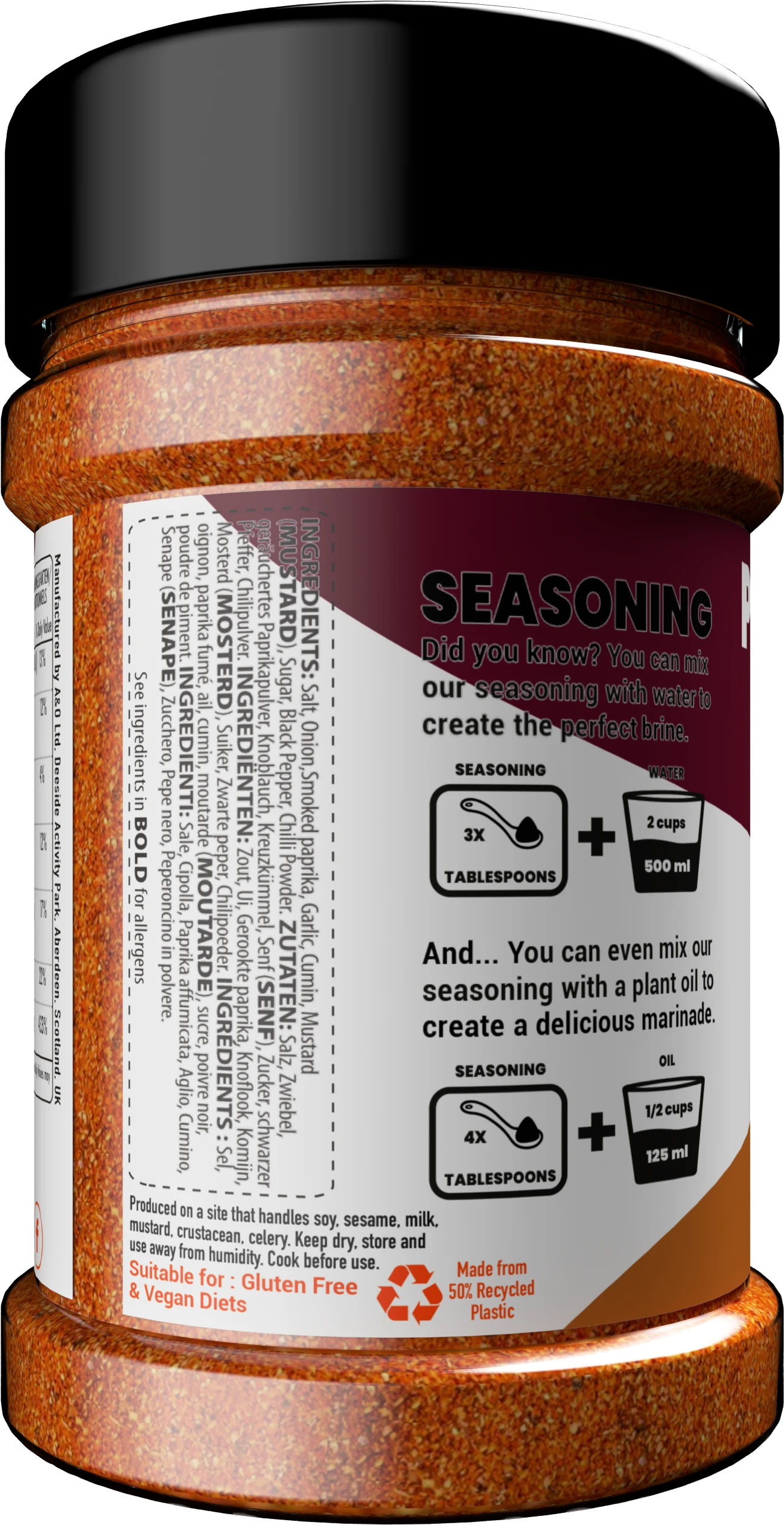 Ingredienti: Sale, cipolla, paprika affumicata, aglio, cumino, senape (SENAPE) zucchero, pepe nero, peperoncino in polvere.