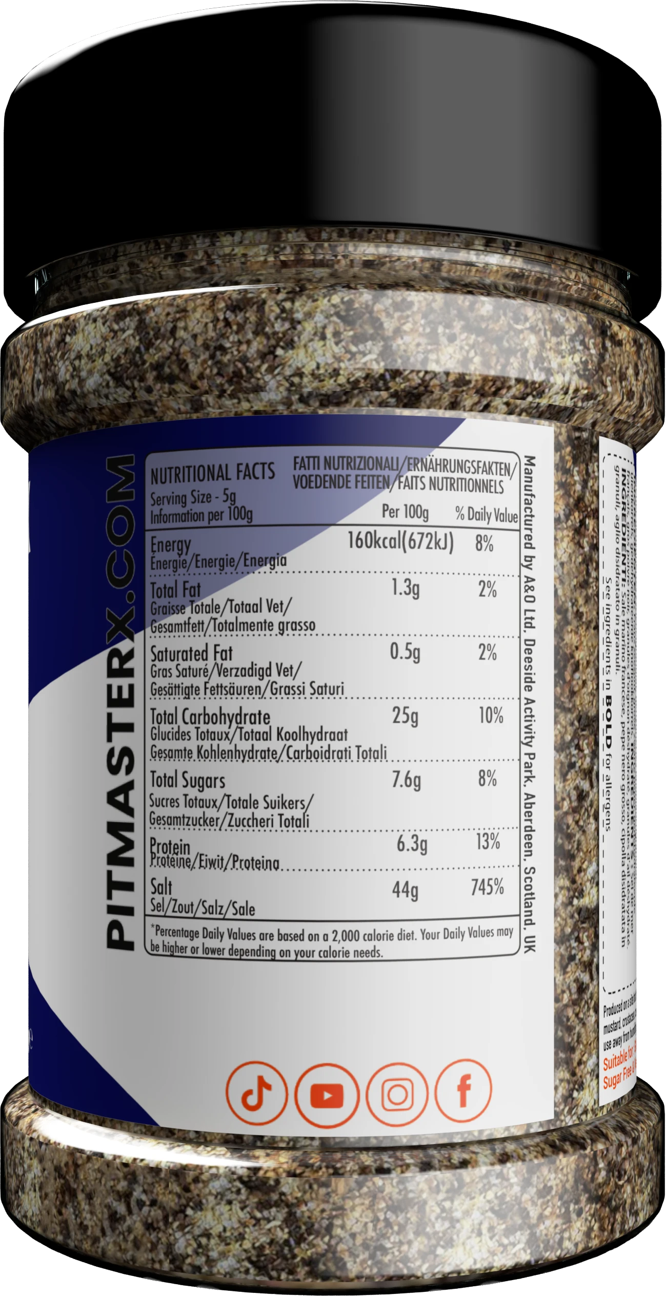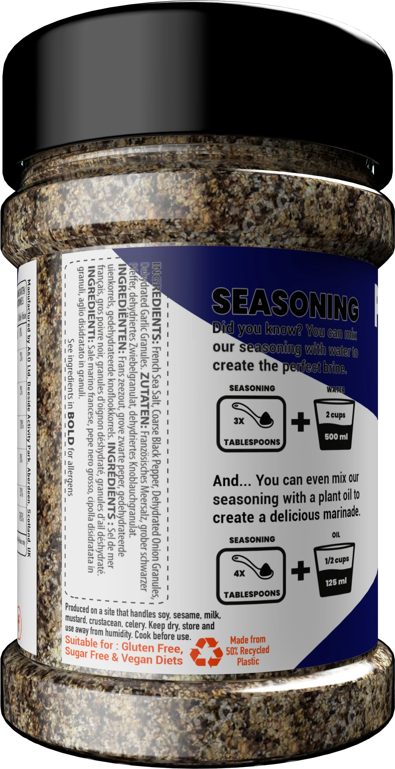 Ingredienti: Sale marino francese, pepe nero grosso, cipolla disidratata in granuli, aglio disidratato in granuli