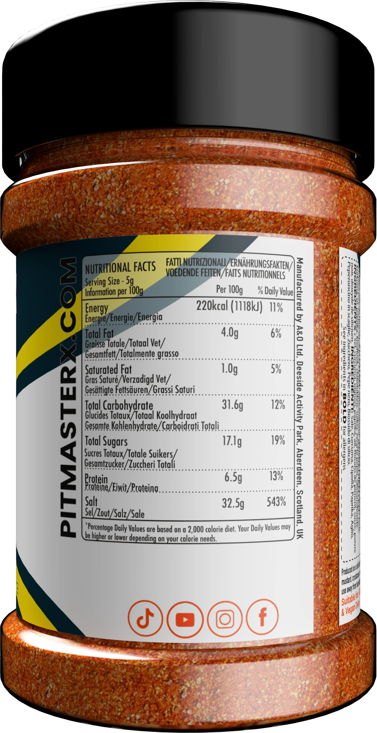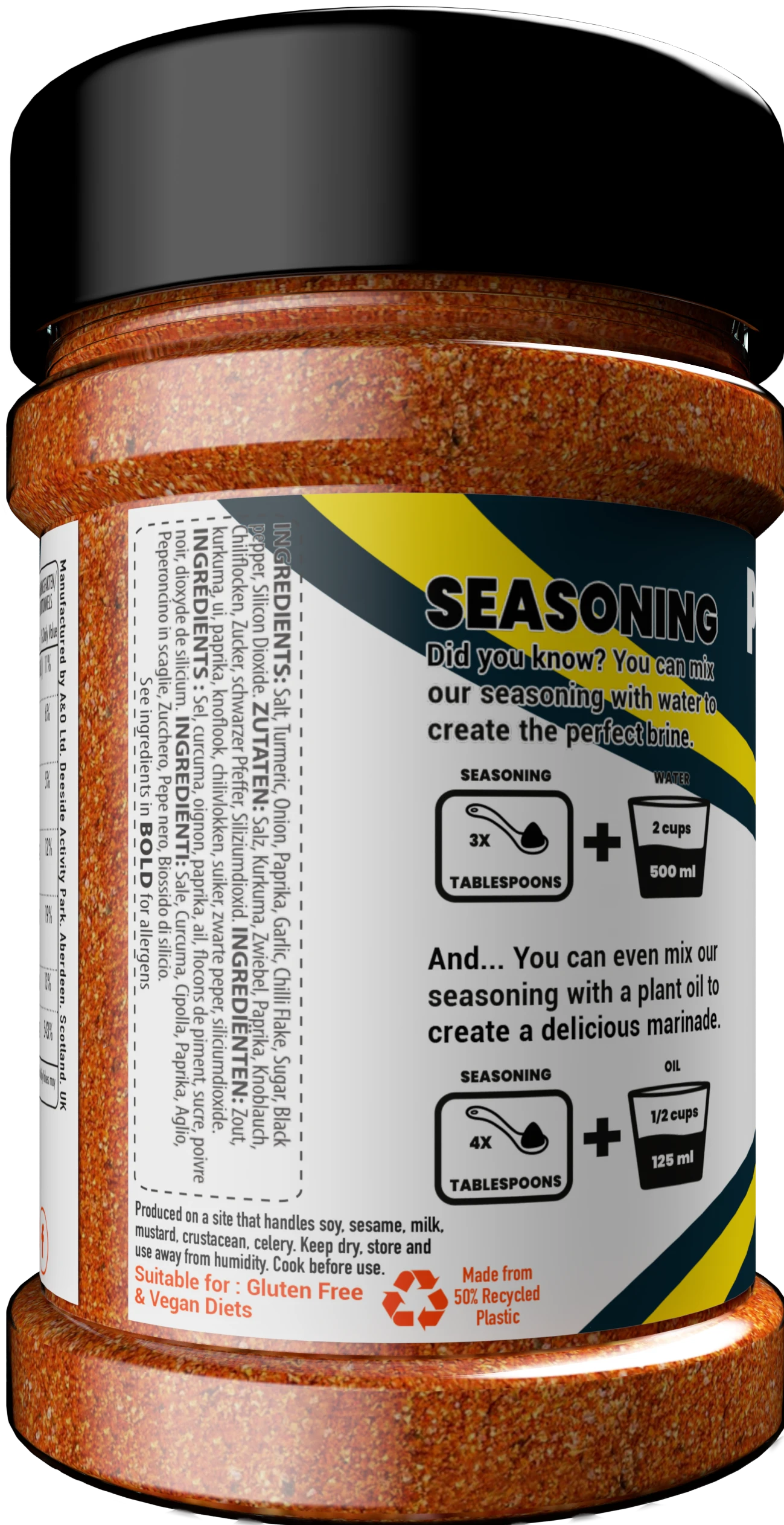 Ingredienti: Sale, Curcuma, Cipolla, Paprkia, Aglio, Peperoncino a scaglie, Zucchero, pepe nero, biossido di silicio