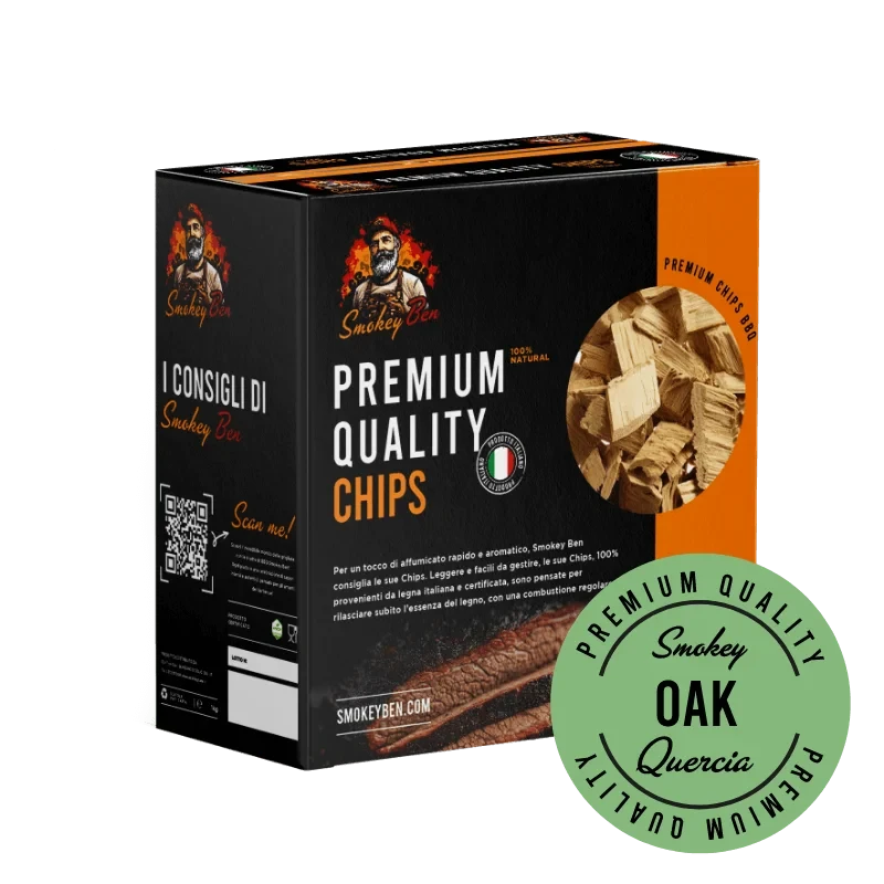 Le chips di Smokey Ben sono realizzate con legno vergine di origine italiana, selezionato per garantire una combustione rapida e un fumo ricco di aromi naturali.