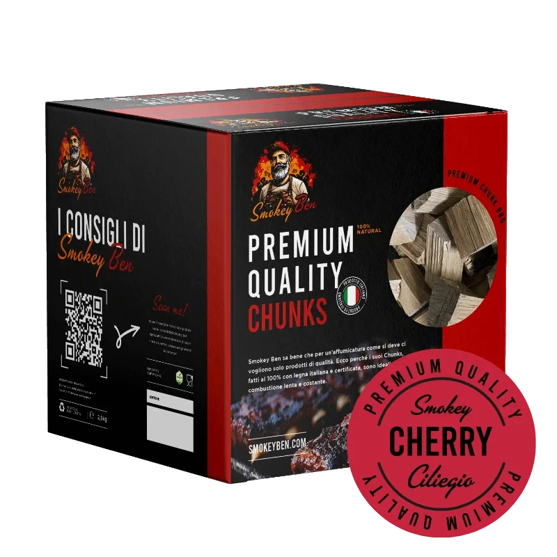 Smokey Ben sa che un’affumicatura perfetta parte da materiali di qualità. I suoi chunks, realizzati al 100% con legna italiana certificata, bruciano lentamente e in modo uniforme, garantendo un fumo equilibrato e un’affumicatura omogenea, che valorizza ogni piatto con il sapore genuino del legno.