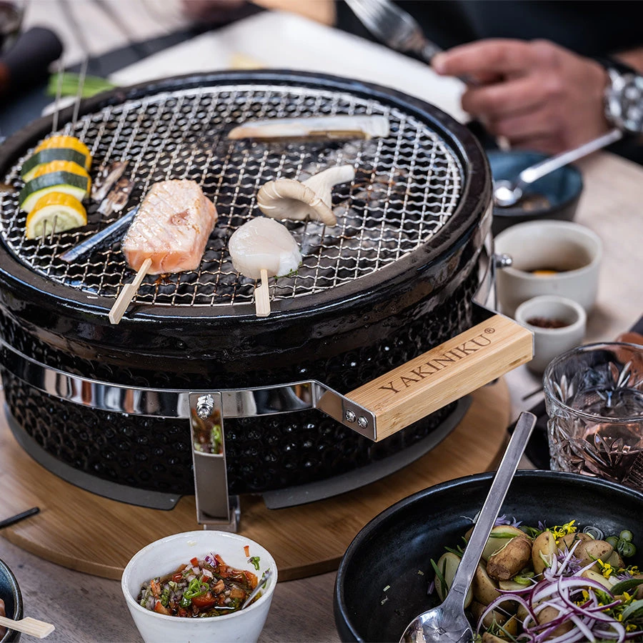 Lo Shichirin di YAKINIKU è realizzato in ceramica con quarzo e cordierite e splendidamente rifinita con dettagli in bambù e acciaio inossidabile. Grazie alla ceramica, la griglia risulta facile da pulire e in grado di mantenere temperature in maniera ottimale.